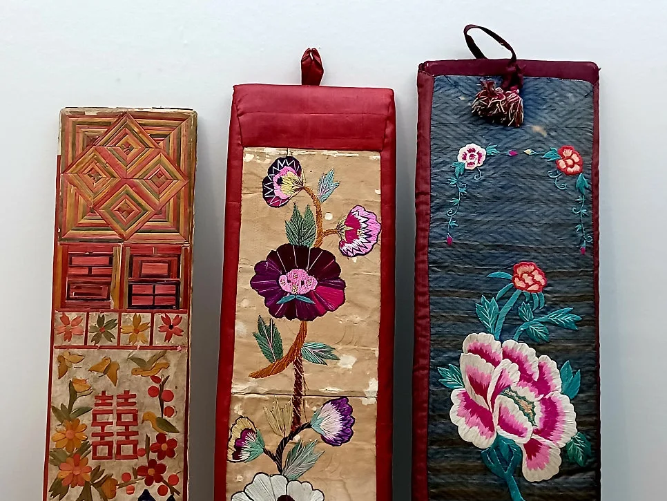 자수로 곱게 장식된 다림질판/ 동양사상에서 대지인 사각형은 여성을 상징, 여성용 베갯모/ 원으로 상징되는 하늘인 남성의 원통형 베갯모