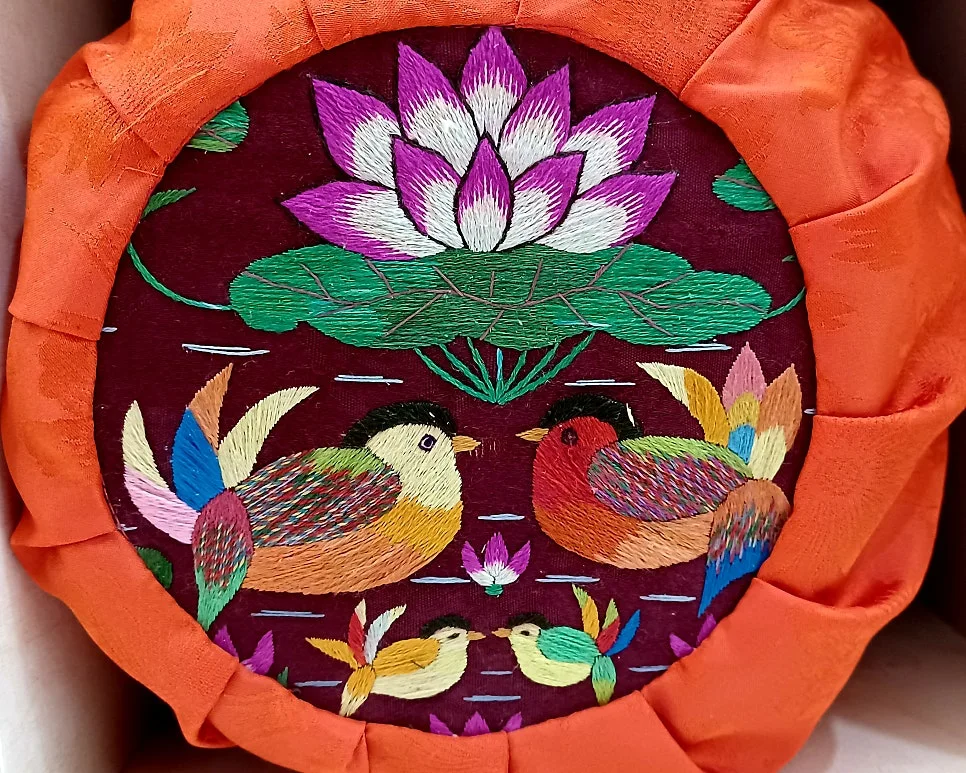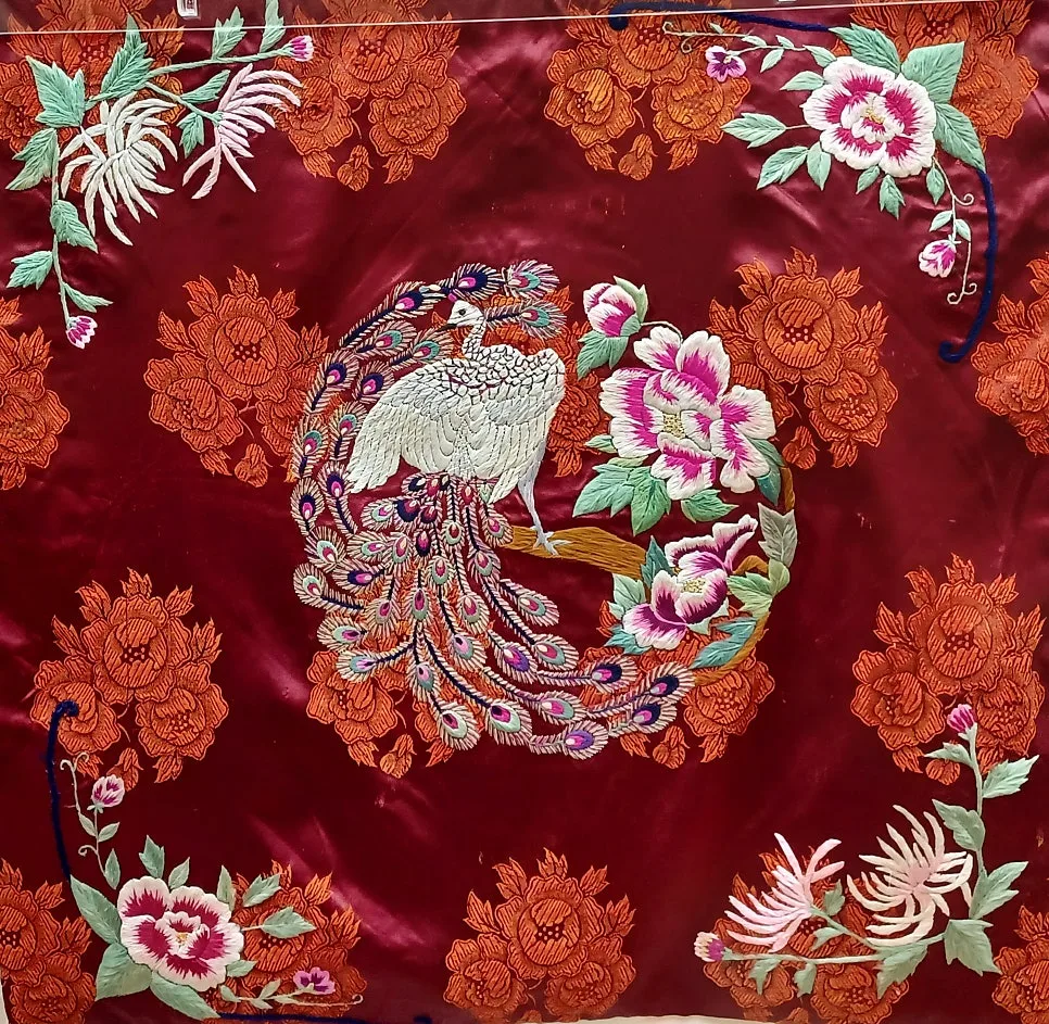 전통혼례 시 목기러기를 싸는 기러기보로 겉감은 다홍색 비단에 수를 놓고 고동색 안감을 대며 테두리는 검은색 면으로 바이어스 처리/ 상보/ 책보