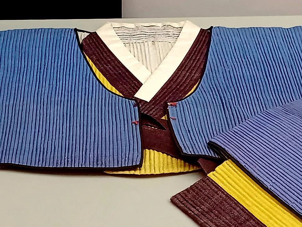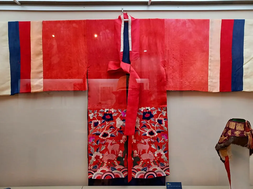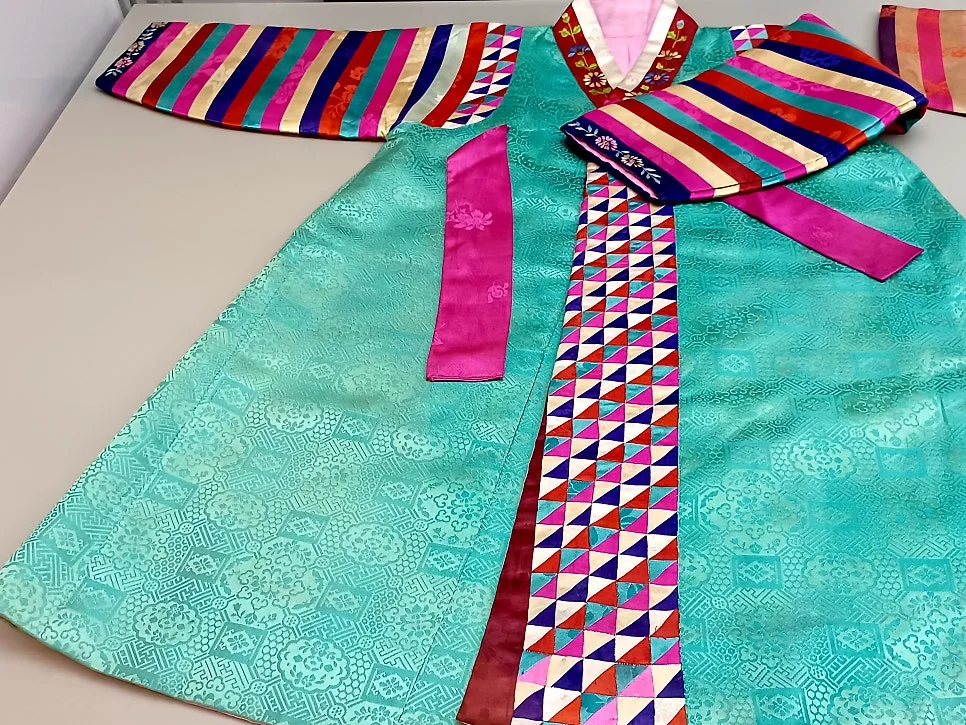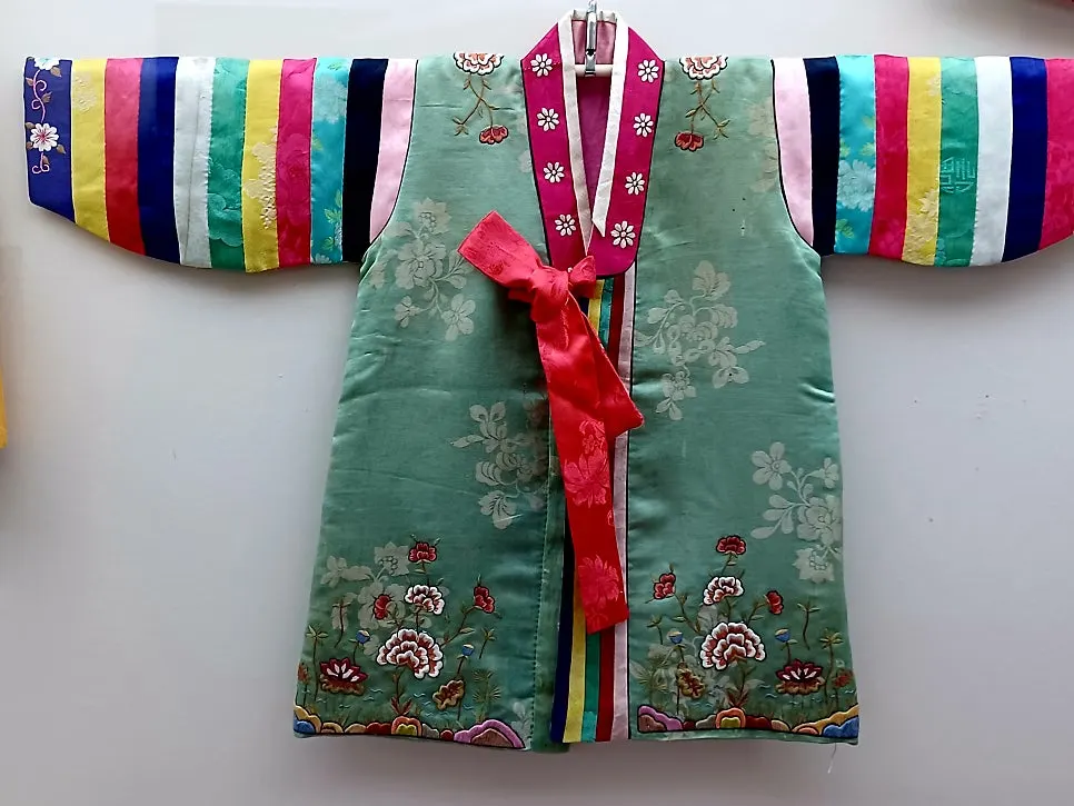 무병장수를 기원하는 바람이 담긴 수를 놓은 아동용 까치두루마기와 은은한 색상의 명주비단천이 담긴 반짇고리