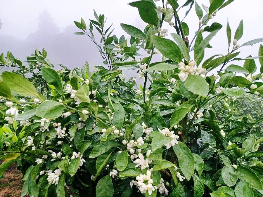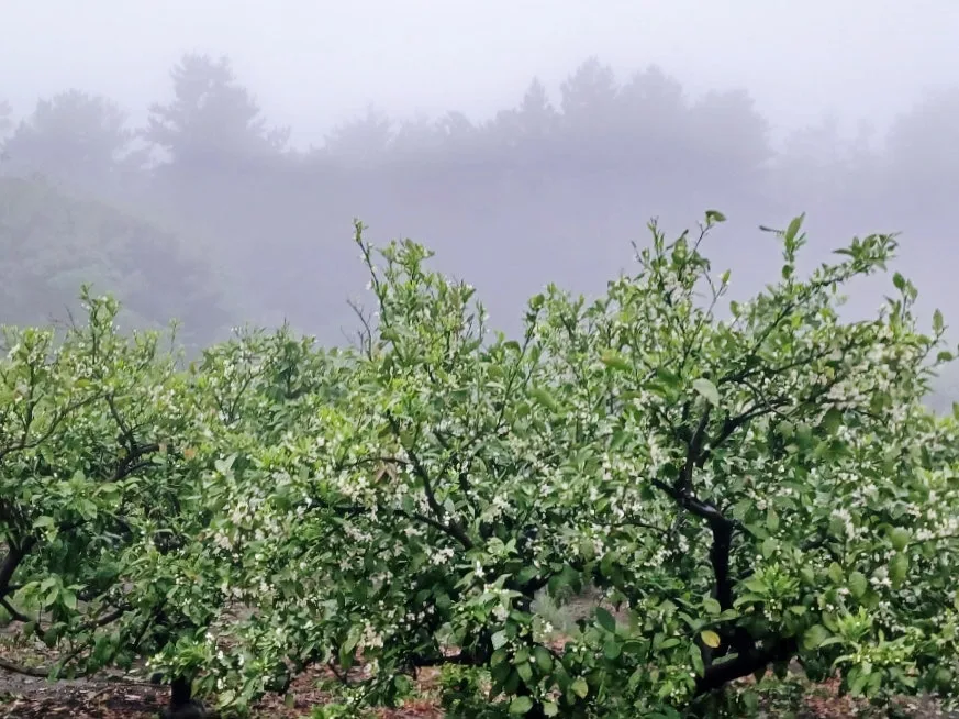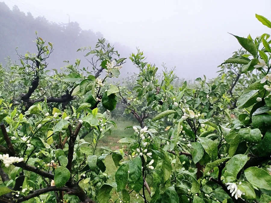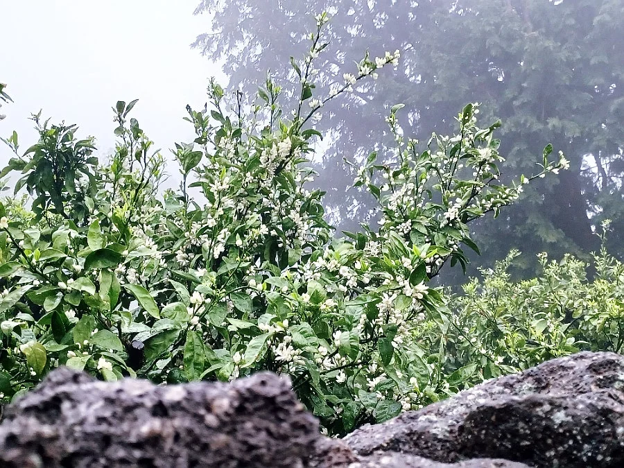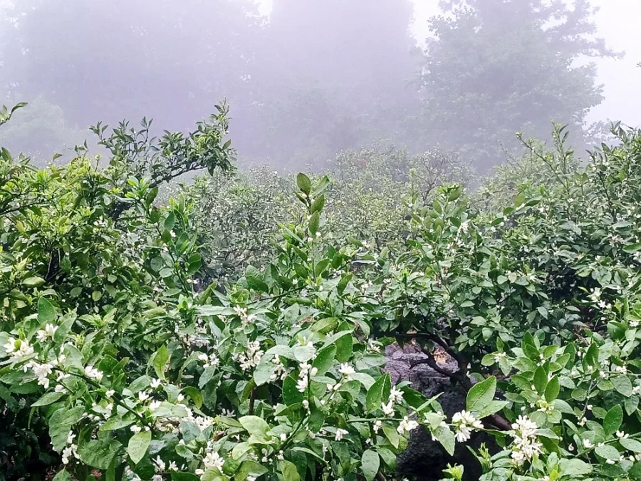 저기압에다 농무까지 짙다 보니 골짜기 가득 청신한 꽃내음이 가라앉아 있어 우린 귤꽃향에 함뿍 취해 들 수 있었다.