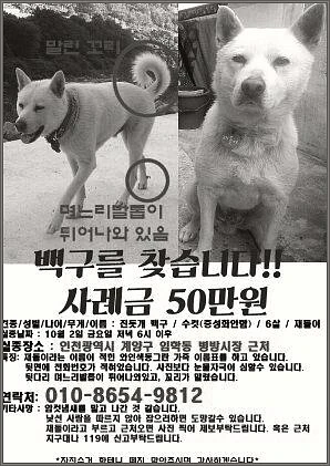 헌데, 아끼던 강아지라 꼭 되찾고 싶으련만 별다른 수식어 없이 실종신고하듯 그냥 '개를 잃었다'며 만일 눈에 띄면 연락해 달라는 전화번호뿐이다.