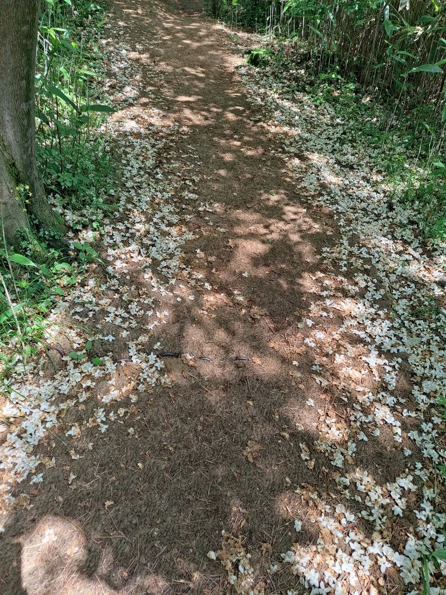 엊그제라도 올 수 있었더라면 송이째 떨어지며 흩날리는 꽃 세례 받았으련만...