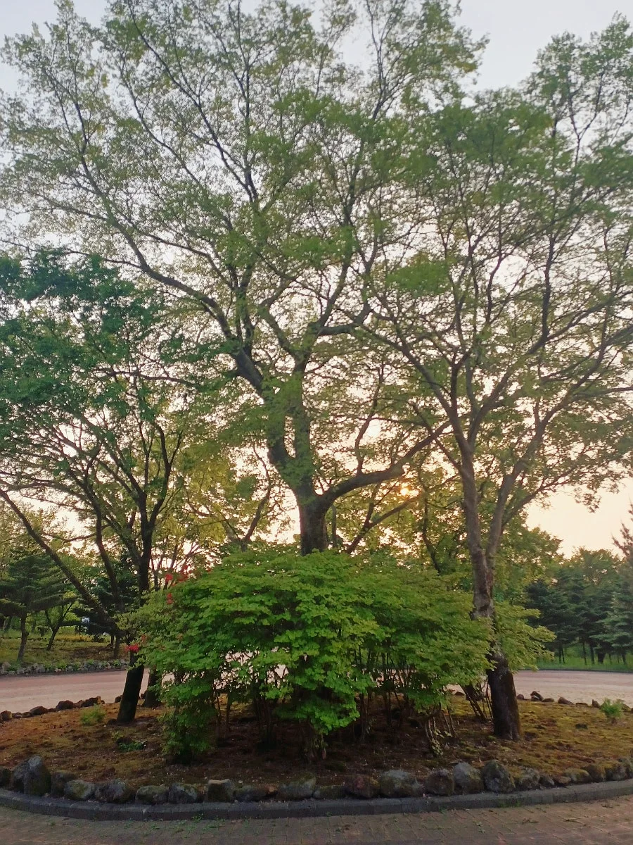 광장에 둥글게 서있는 나무들 사이로 노을빛 불그레 어려 들었다.