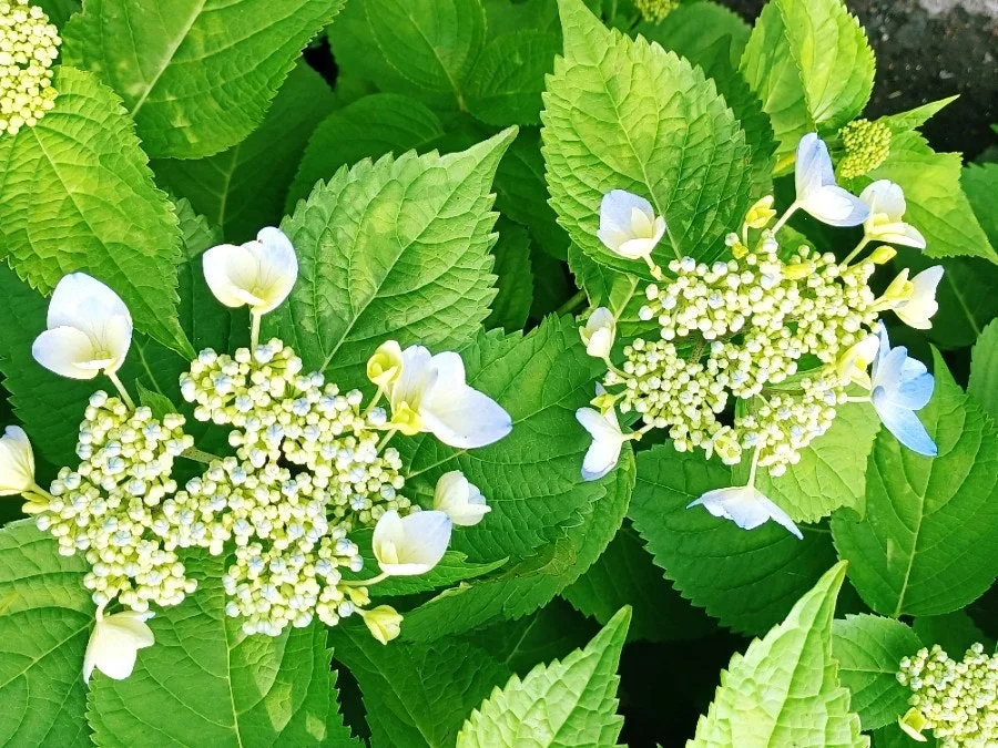 물빛 산수국 피어났으며 소담스러운 수국꽃도 벙글기 시작했다.