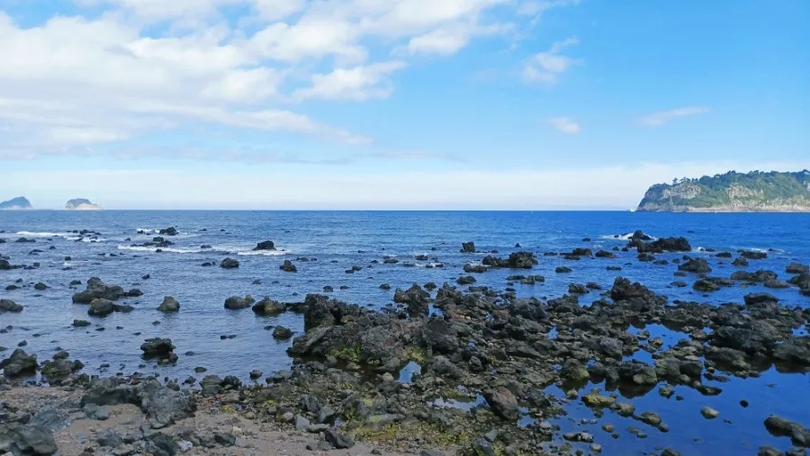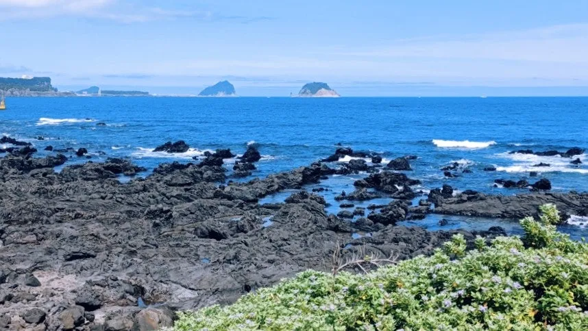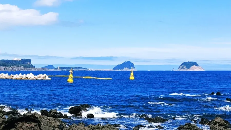 짙푸른 바다로 길게 뻗어나간 검은 여는 징검다리 되어 범섬과 잇닿을 듯 통통통 물수제비를 뜨고 있다.