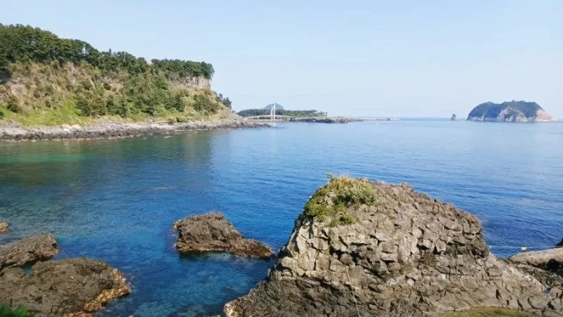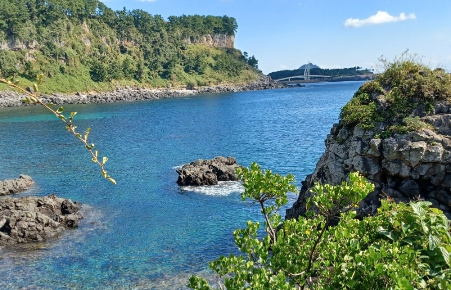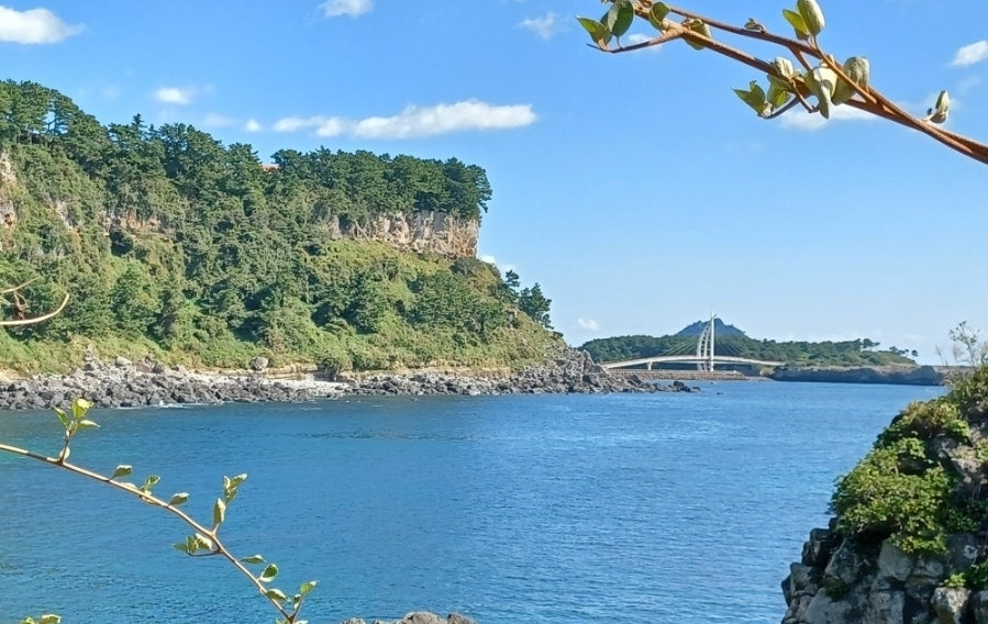 물빛 고운 바다 저만치 세연교 막 비상하는 하얀새, 오른쪽으로는 5분쯤 걸어가면 외돌개 우뚝 솟아있다.