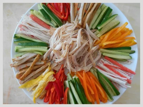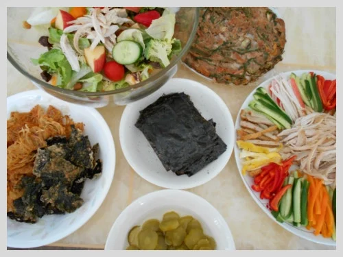 야채재료와 게맛살 계란지단 튀김어묵 닭가슴살을 키 맞추고 색 맞춰 썰어 모둠접시에 두르고 살짝 불김을 쐰 생김에 각종 재료를 싸서 겨자간장에 찍어먹는 화합의 음식 구절판이 메인이다.