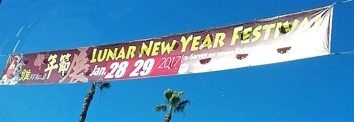 새해 페스티벌을 알리며 도로 위에서 펄럭이는 현수막에는 날개 활짝 편 닭이 웃고 있었다.