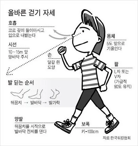 내 경우 일주일에 닷새를 30분씩 오고 가며 걷다 보니 바른 걸음걸이가 궁금해 검색 통해서 제대로 익혀뒀다.