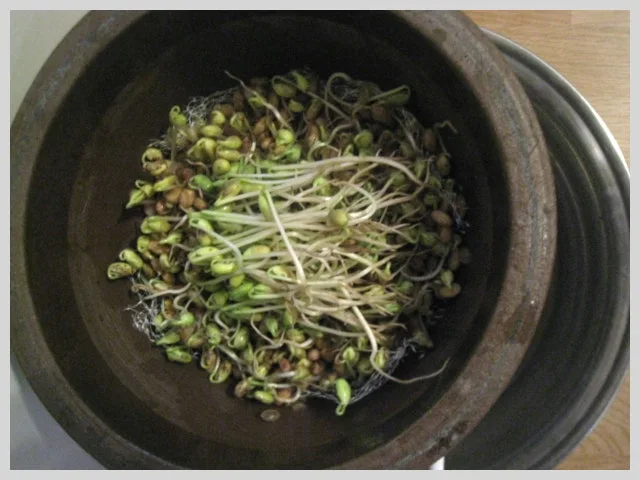 콩을 불려 시루에 안치고 적당한 걸개를 얹어 올려놓은 다음 짙은 색 타월로 잘 덮어주었지요.