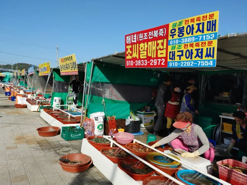 바닷물 찍찍 쏘아대는 성게 해삼 전복 문어 굴 소라 멍게 가리비 개불까지 온갖 해물이 전을 펼쳤다.
