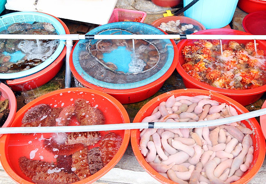 해산물이 종류별로 들어앉은 벌건 플라스틱 함지박마다 해수가 조달되면 한편에선 연신 물이 흘러넘친다.