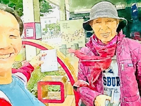 시청사 앞에서 하영올레 카드에 스탬프를 꾹 누르고 나더니 그녀는 오늘의 만남을 기념해야 한다며 셀카를 찍었다.