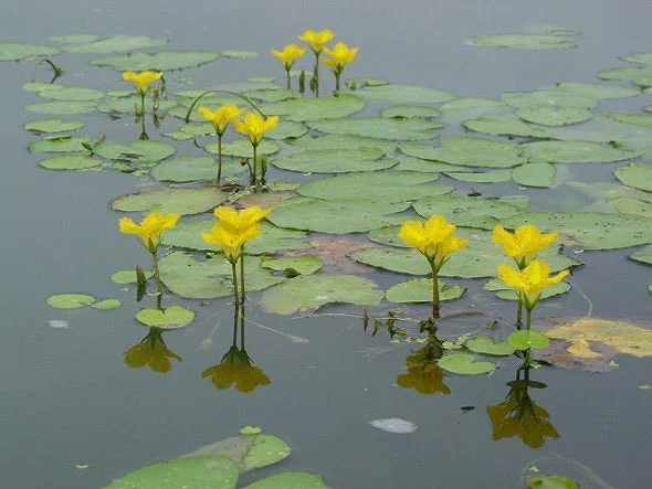 어느 날, 부들 사이로 점점이 찍힌 선명한 노란 색깔이 시선을 잡아끌었다. 바짝 물가로 다가가보니 앙증스러운 작은 꽃들이 군락을 이룬 채 피어있었다. 꽃을 내려다보며 동그마니 뜬 이파리들은 수련을 꼭 닮아 한쪽 면은 치즈 케이크를 자른 듯 트여 있다. 하긴 큼직한 연꽃에서부터 물옥잠까지 통틀어 워터 릴리란 명패를 일률적으로 부여한 미국이니 옐로 워터릴리라 불러도 무방하지 싶다. 노란 어리연꽃을 만나 눈인사를 나눈 다음부터 그 연못에 가면 발길은 절로 수문통 방향으로 이끌린다. 찰랑대는 물결 따라 나붓나붓 흔들리는 꽃을 지켜보기도 하다 잎을 바라보다 하노라면 마음이 고요하니 호젓해진다. 잠시 선에 든듯한 평온감을 느끼는 것이다.