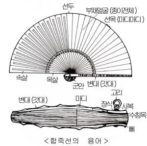 맨 아래 그림의 설명을 보면 부채 양쪽 가장자리를 지탱시키는 대나무가 붙어있는데 이 변대의 대나무 뿌리 마디에 따라서 가격이 형성된답니다.