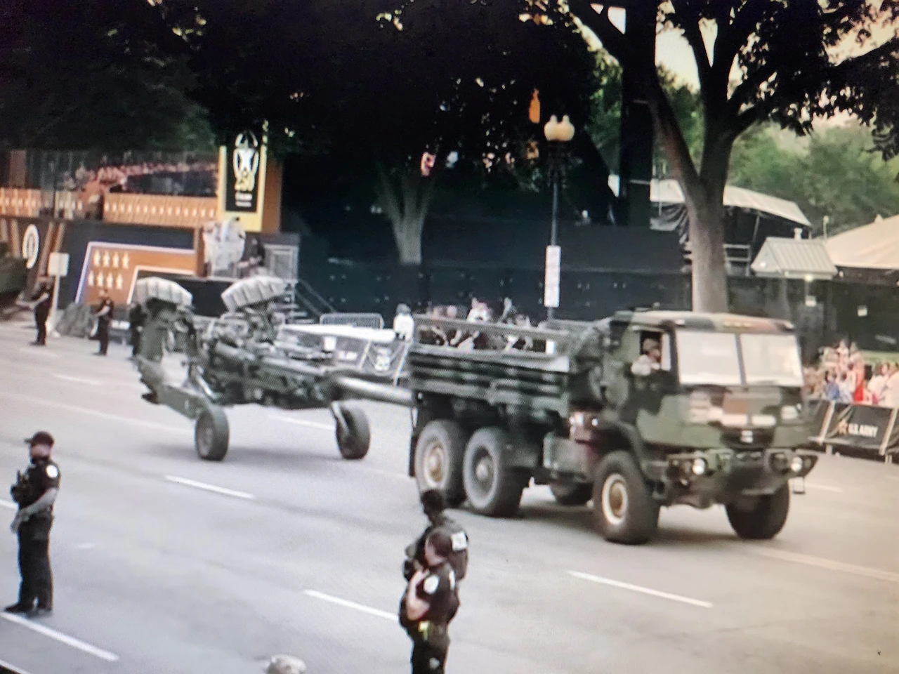 독립전쟁 당시를 재연한 퍼레이드에 이어 2차 대전, 한국전, 베트남전, 걸프전 모습도 화면에 오래 잡혔다.