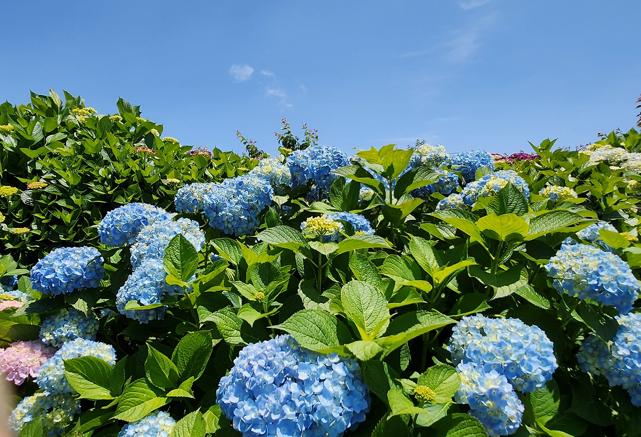 올해는 윤달이 들어 꽃철도 덩달이 늦어진 까닭에 수국도 이제야 겨우 푸르고 붉은 물색 오르고 있지만.
