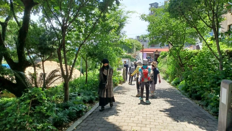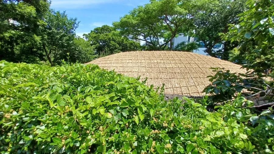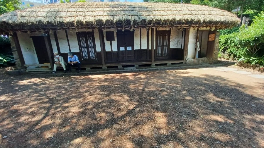 어느새 신록 깊어져 초가지붕이 녹음 속에 폭 싸 안겨 있었다.