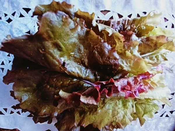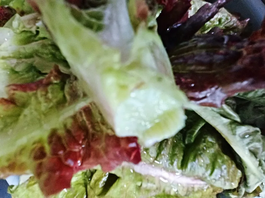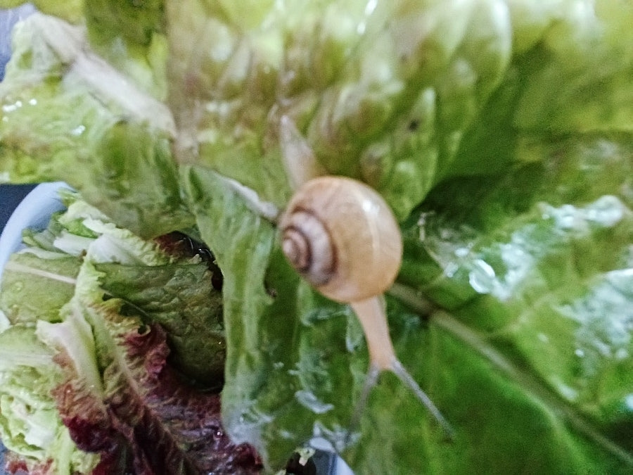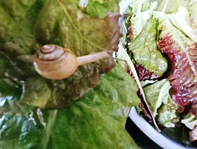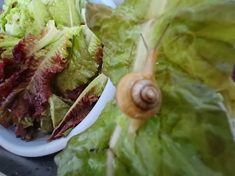 붉은 잎 상추 일부를 다듬어 씻는데 엄지손톱만 한 달팽이가 이파리 뒷면에 붙어있었다.