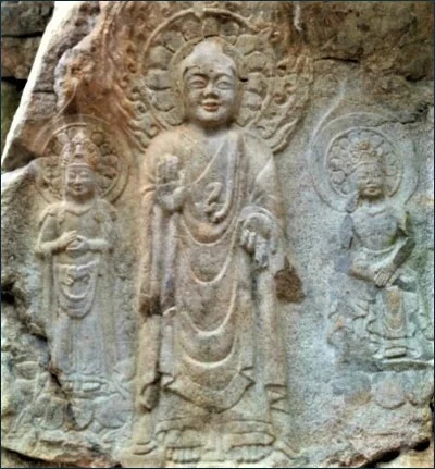 편편한 거대 입석에 중앙은 현세불을 의미하는 석가여래 입상, 왼쪽은 과거불을 뜻하는 제화갈라보살 입상, 오른쪽은 미래불을 나타내는 미륵반가사유상이라 전해 들었던 바 그대로 거기 계시더이다.