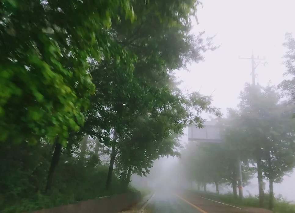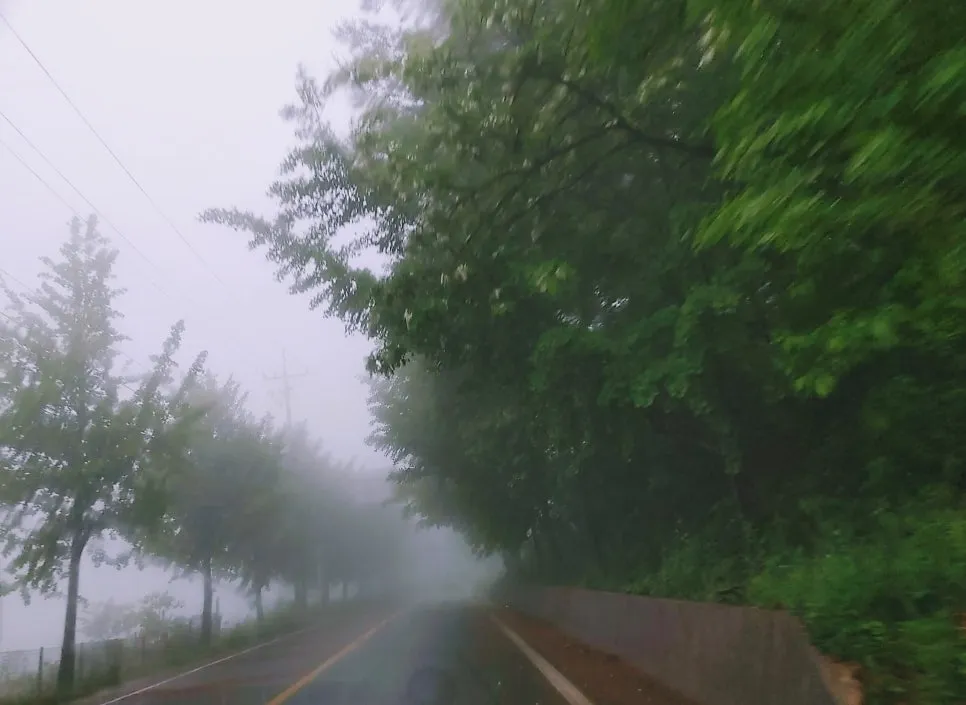 의령 지나 황매산 가까이에 이르니 비 그친 대신 도로 선이 희미하게 보일 정도로 도처에 안개 짙게 깔렸다.