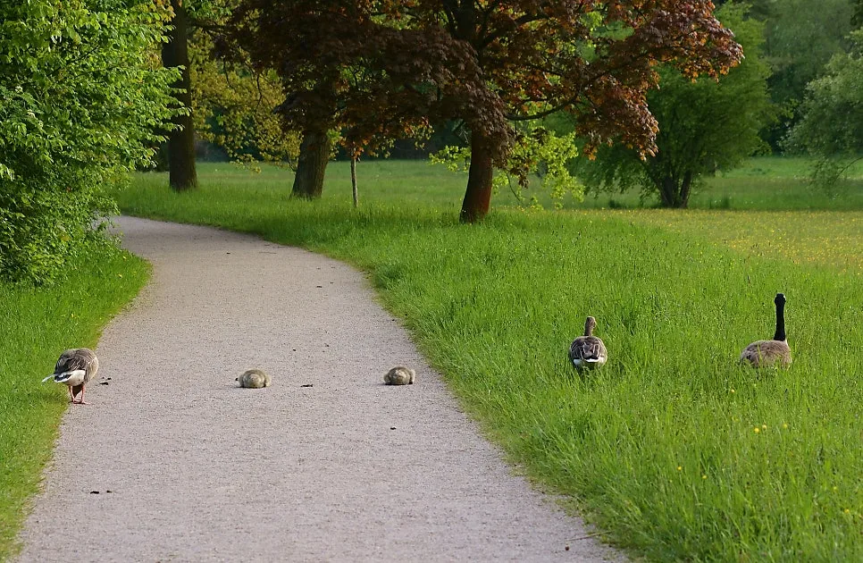 길을 건너는 구스(goose) 가족이 전혀 서두름도 없이 그야말로 겁도 없이 뒤뚱거리며 대로를 횡단 중