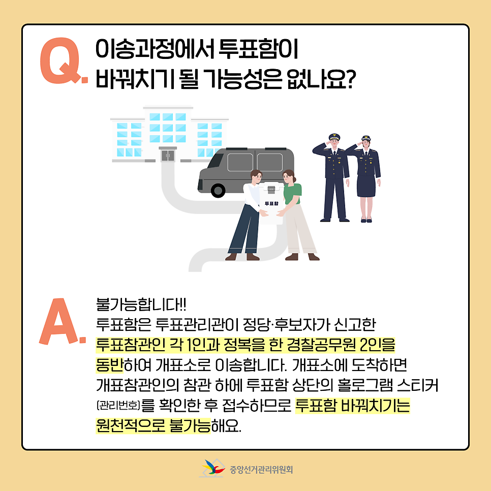 봉인된 투표함을 실은 차량에는 투표관리관 두 명과 투표 참관인 두 명에다 경찰관 두 명도 동승했다.