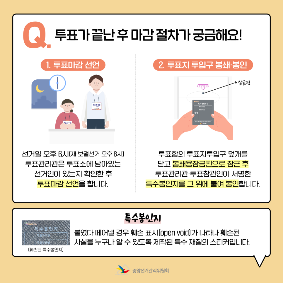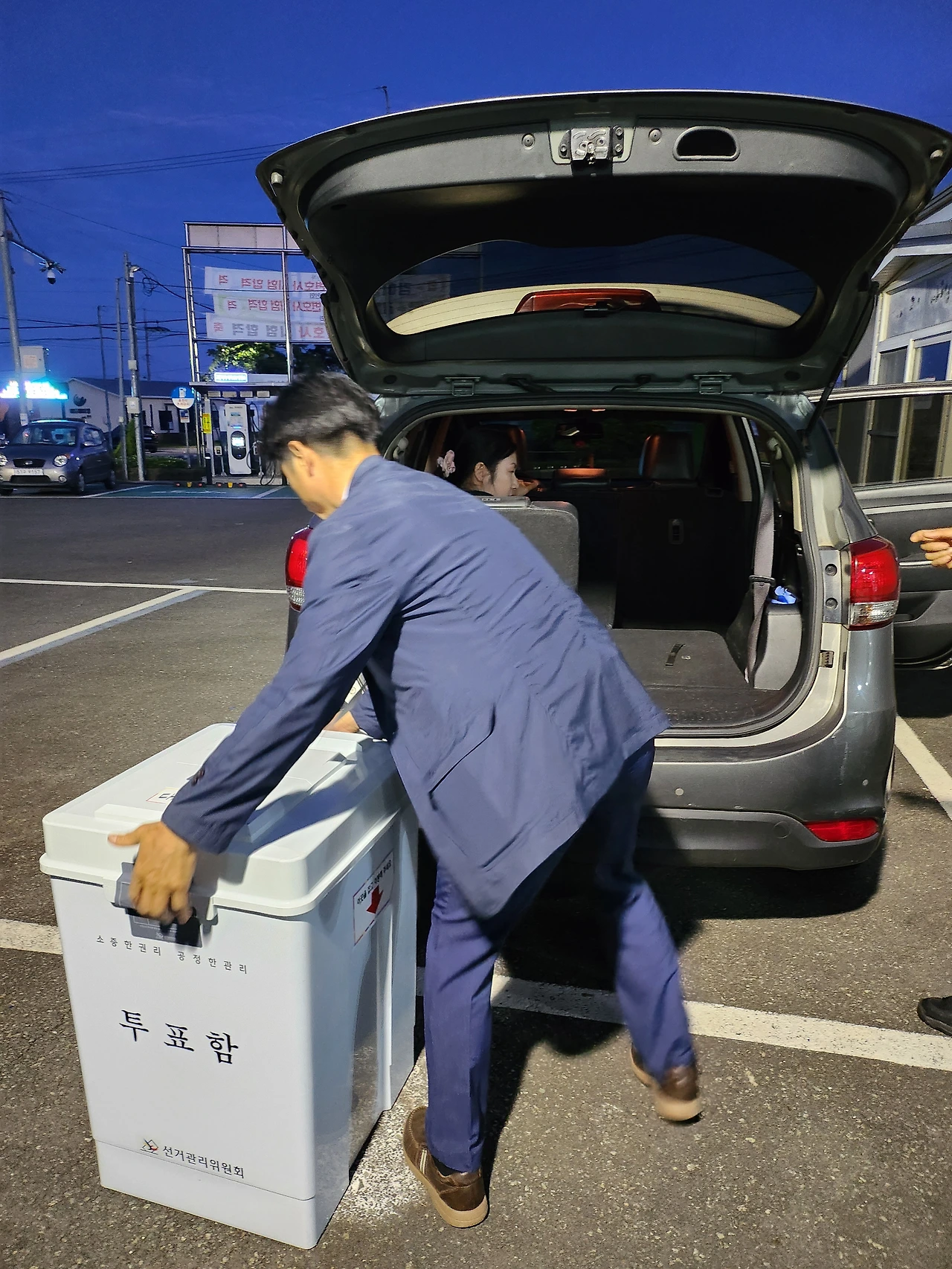 관리관은 투표록과 선거인 명부 등 투표관계 서류 일체를 봉투에 넣어 테이프로 봉함하고 봉인을 찍어 투표함과 함께 차에 올랐다.