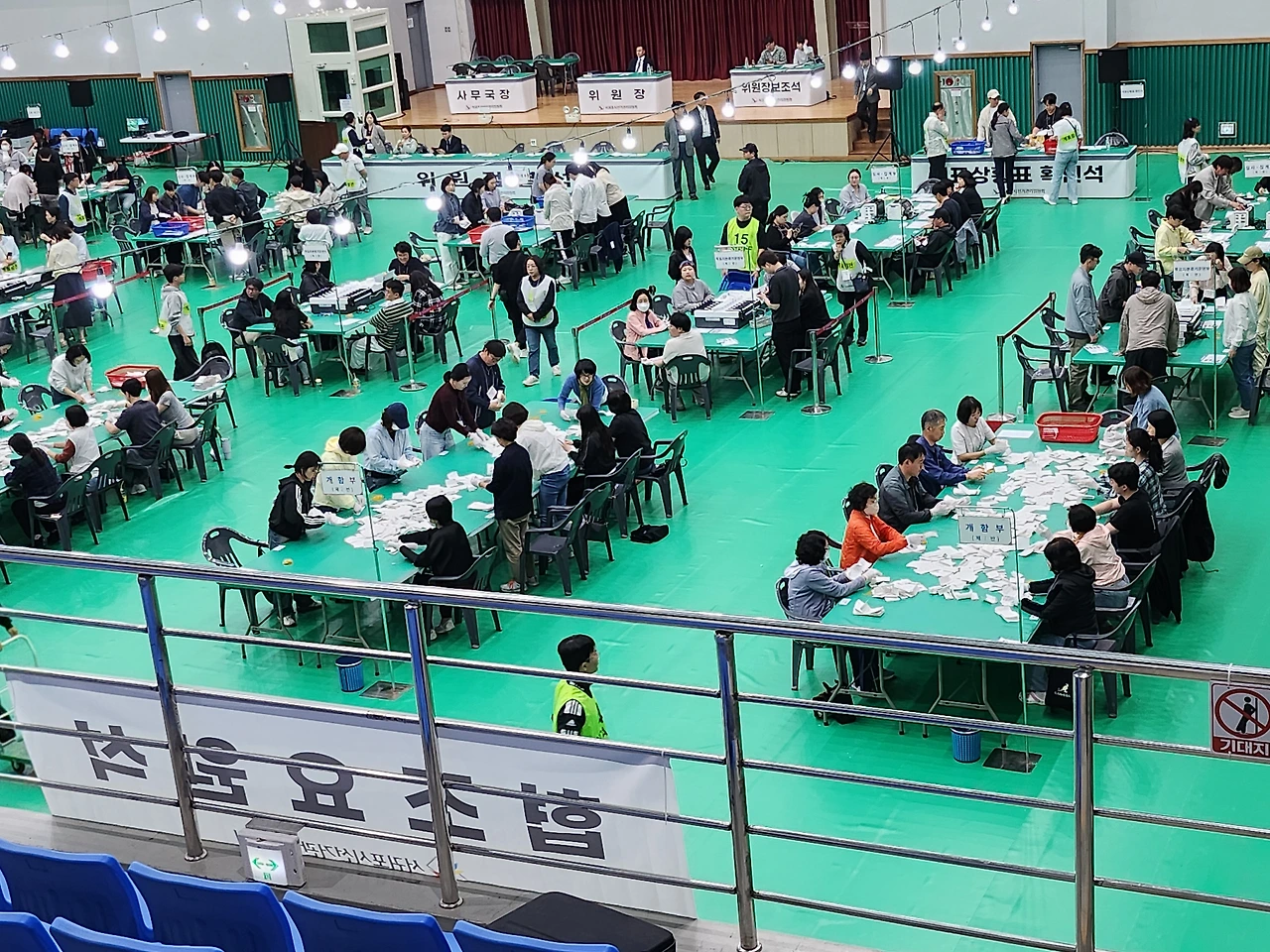 이미 88개소의 투표장에서 동시에 마감된 투표함이 도착한 체육관 주변은 차들이 밀려들어 북새통을 이뤘다.