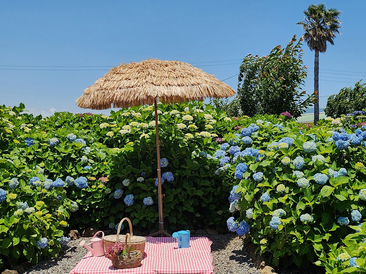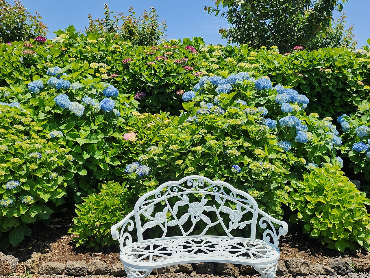 이 마을에서 오래 감귤 농사를 짓던 분이 농원 한켠에 수국밭을 조성해 화원을 개장한 지 몇 년째 됐다는 화원은 푸른 하늘과 어우러진 색색의 수국꽃 아기자기하게 펼쳐져 앞으로 해가 덧쌓일수록 볼만해 지겠다.