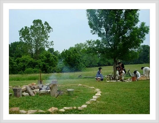 독립전쟁 당시의 사병 막사, 임시로 친 텐트도 있으나 장기 야영을 위한 오두막이 죽 늘어섰다.