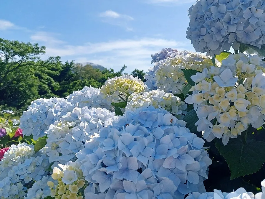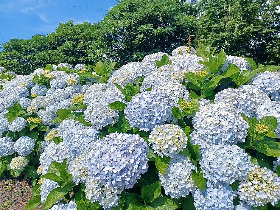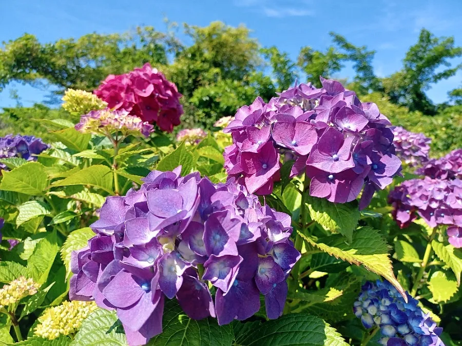 마침 쾌청한 하늘에 살풋 구름이 낀 멋진 날씨라 수국꽃과 조화 이룬 하늘 위주로 사진에 담았다.