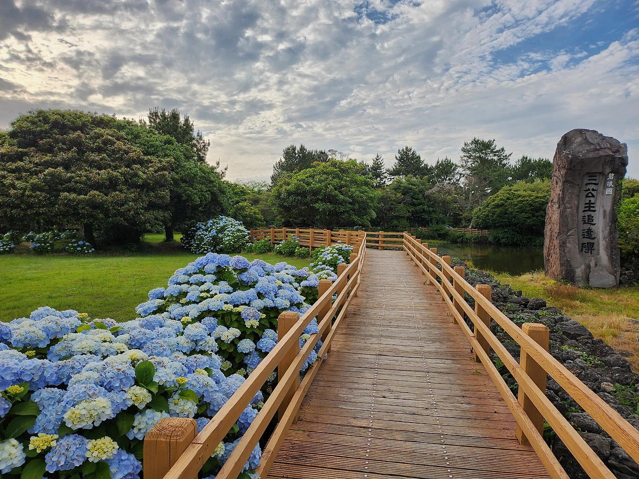 연못가에도 주변 탐방로에도 신방굴 앞에도 삼공주 추원사 인근에도 수국꽃 탐스러이 흐드러졌다.