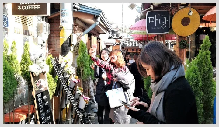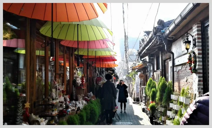 한국에서 근자 남녀노소 가릴거 없이 한창 뜨고 있는 트렌드인 패딩 재킷들이 나직나직 이마 맞댄 한옥골목을 속살대며 누비고 다녔다.