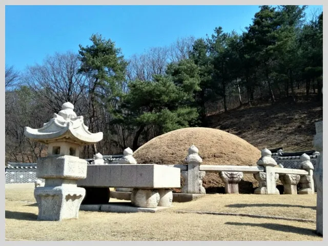 서오릉은 도시의 빌딩숲 바로 옆, 너그러운 산세를 지닌 야산 자락에 소나무 참나무 우거져 있는 무척 넓은 터를 깔고 앉았다. 살아생전 최고로 호의호식하며 대궐에서 지내다가, 눈 감은 다음 역시 풍광 좋은 자리의 곱게 다듬어진 잔디 아래 잠들 수 있는 특혜를 누리니 선택받은 왕가는 왕가다. 능침 내 제향공간에는 신성지역임을 나타내는 홍살문과 정자각을 세우고 수라간, 수복방, 비각 등이 배치되어 있다. 봉분 주위에는 상석, 장명등, 망주석, 문무석, 석상이 도열해 있으며 동, 서, 북 방향으로 능을 감싼 곡장(담장)을 둘렀다.