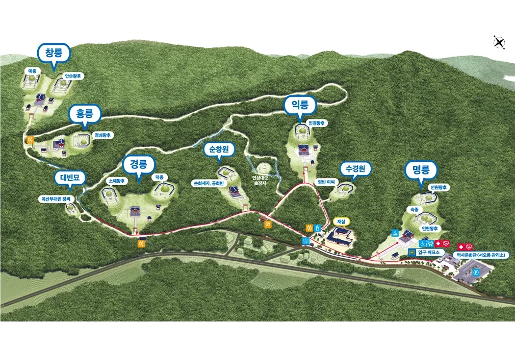 순창원에는 명종의 원자로 열세 살 나이에 세상을 뜬 순회세자와 공회빈 윤씨를 합장했다. 수경원은 조선 영조의 후궁이자 사도세자의 어머니인 영빈 이씨가 묻혔다. 영빈 이씨는 영조가 아낀 후궁으로 영조와의 사이에 칠 남매를 둔 다복한 여인이었다. 그러나 사도세자의 생모였던 그녀는 혜경궁 홍씨의 한중록에 쓰여진 바에 따르면, 영조가 세자 문제로 고심하고 있을 때 결단을 아뢸 정도로 냉엄한 지어미였다. 누구라도 자식이라면 제 목숨보다 더 귀히 여기게 마련이거늘 그녀 흉중의 비통함이야 일러 무엇하랴만.