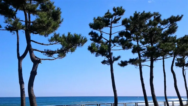 방풍림으로 심었음직한 길가 소나무마다 강한 해풍에 쓸려 우 편향 자세로 비스듬 기울어져 있었소.