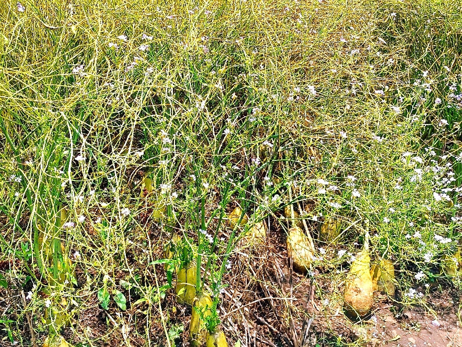 무질서하게 마구 뒤엉킨 줄기는 기운에 벅찬 듯 바로 서지도 못하는 데다 생기 잃은 채 변색이 됐고 밭두렁 무는 반 넘어 헐벗은 채다.
