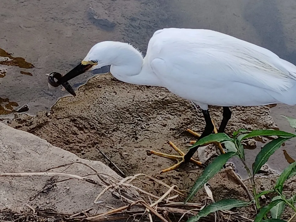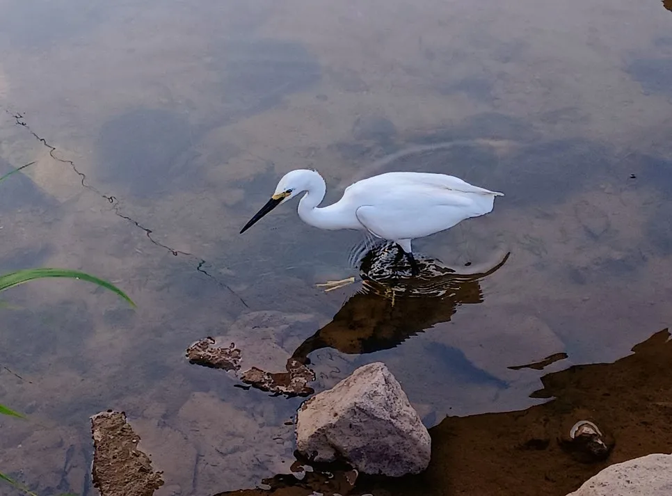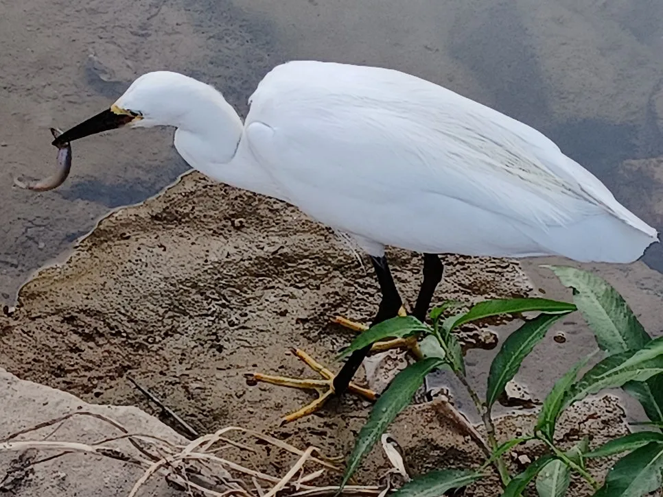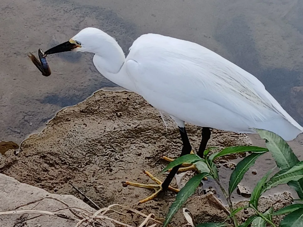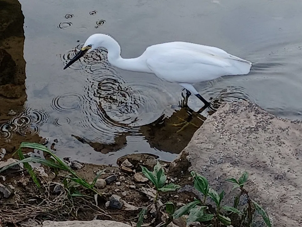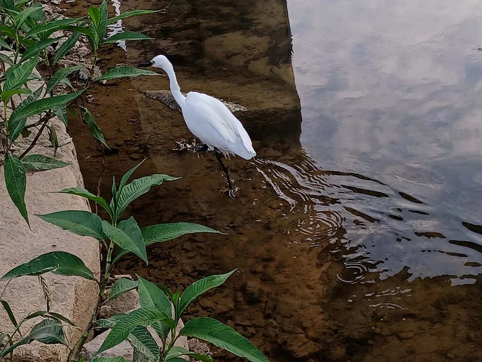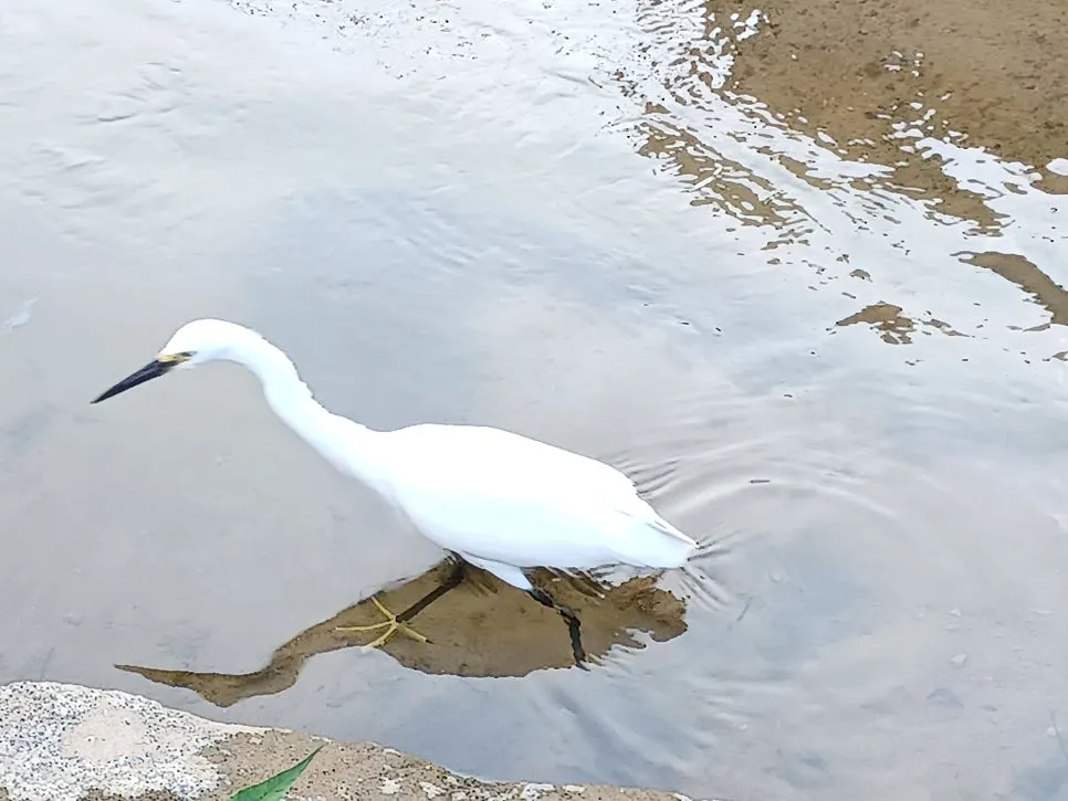 새하얀 백로가 긴 목 이리저리 돌려가며 물속 탐색전을 벌인다.