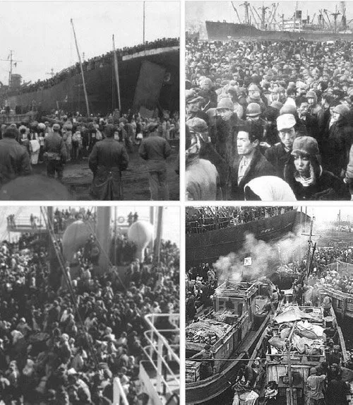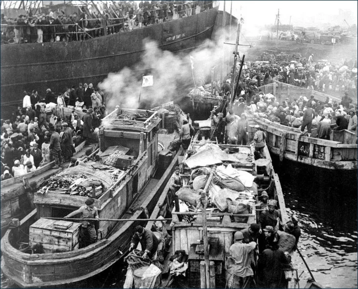 부산은 이미 피난민들로 포화상태라 거제에 도착해 하선하기 위해 빅토리호에서 작은 어선으로 옮겨타 섬으로 들어오는 이 피난민들 행렬을 보라.