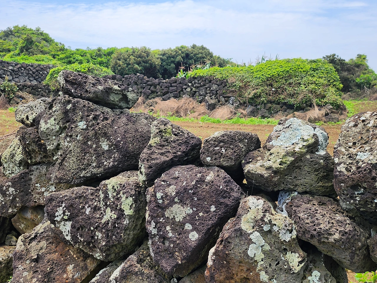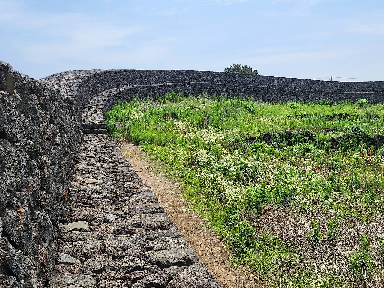성곽 위로 다져진 널찍한 현무암 길에서 사방을 조망해 보기도 하고 아랫녘 밭에서 고구마 심는 모자와 얘기도 나누는 등 제법 한참을 걸어 다닌 길.