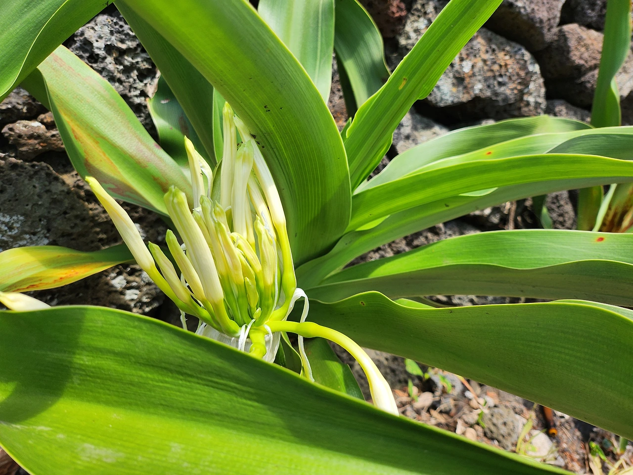 문주란 한 포기만 하얀 꽃대 내비칠 뿐 다들 딴청, 너무 일렀구나 싶어 7월 중순을 기약했다.