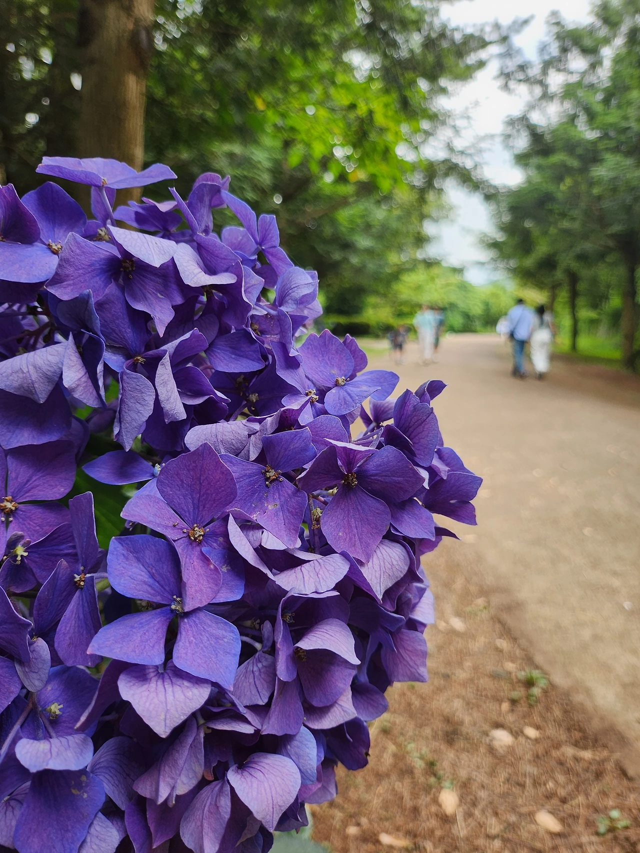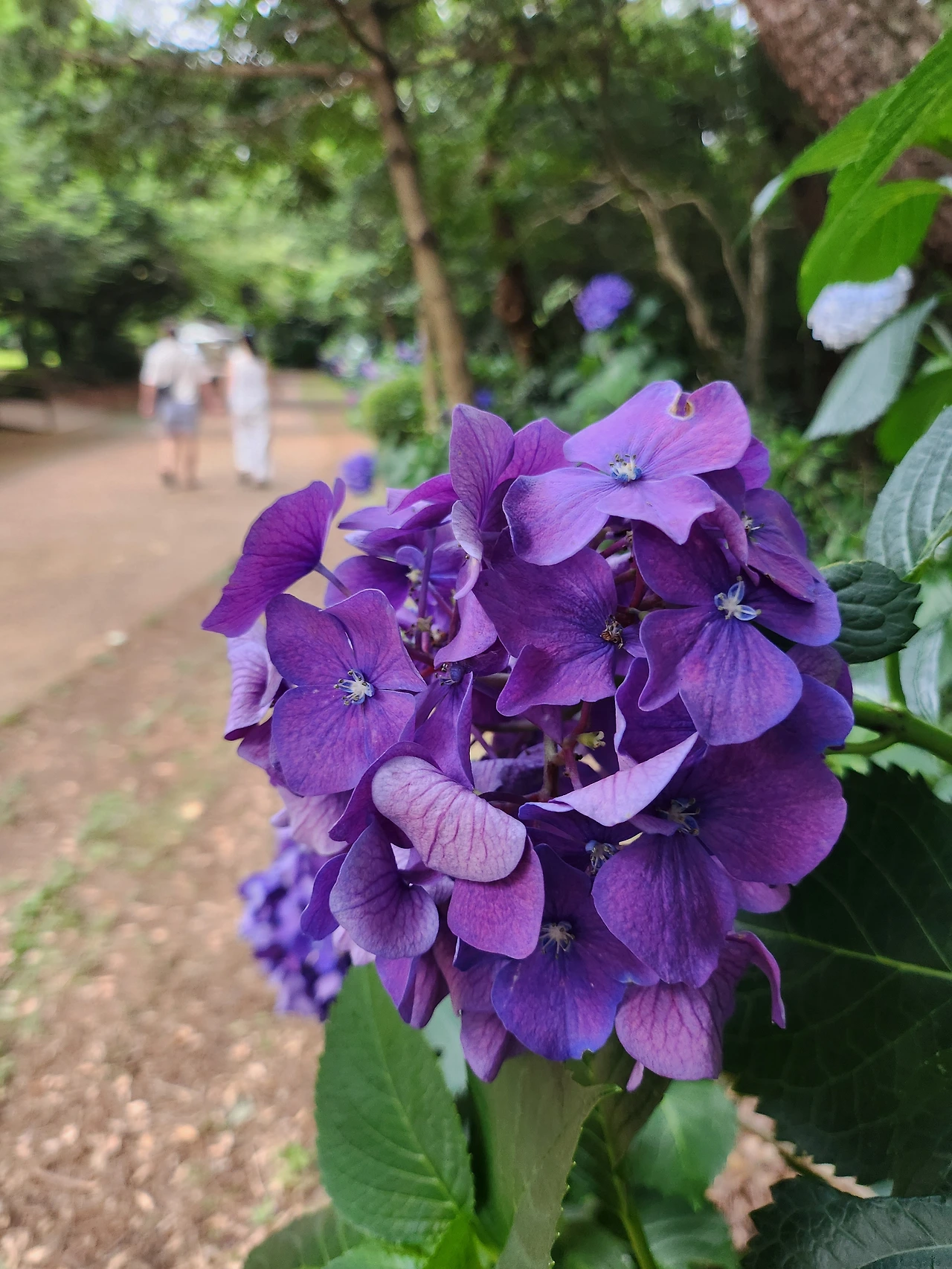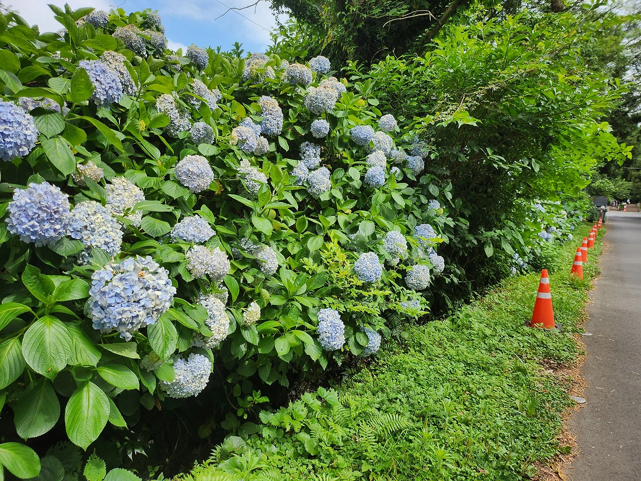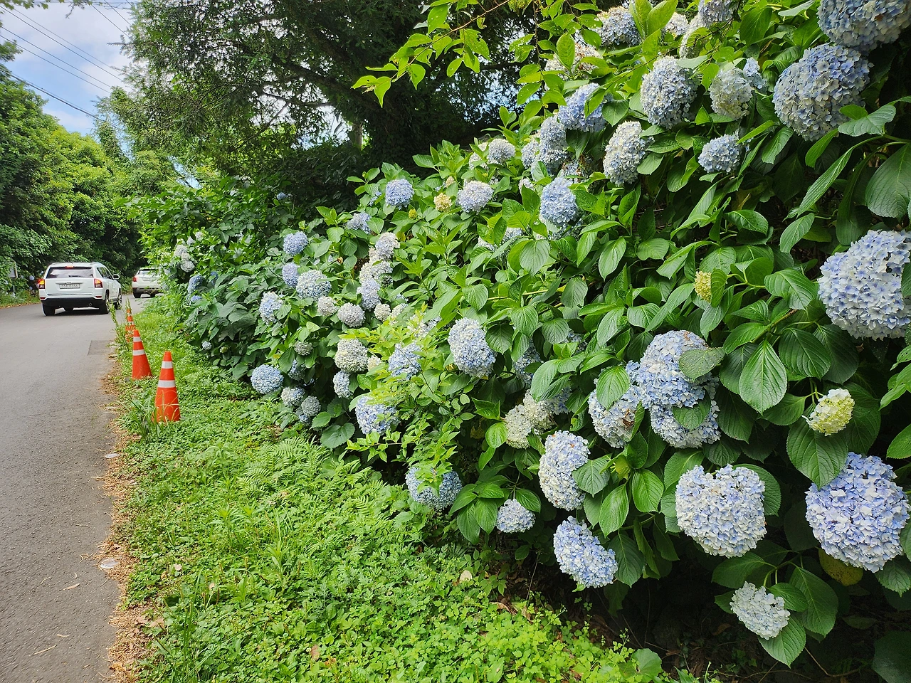 비자림 입구 양쪽엔 내 머리통보다 큰 수국꽃이 소담스레 열을 지어 피어있으나 폭염으로 시들거렸다.