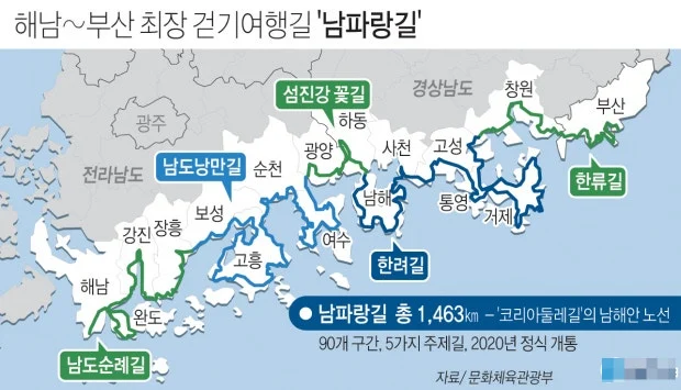 마치 누비 바느질하듯 부산에서 남해안을 따라 촘촘 이어간 남파랑길, 한편 해파랑길은 부산 기점으로 동해안 따라