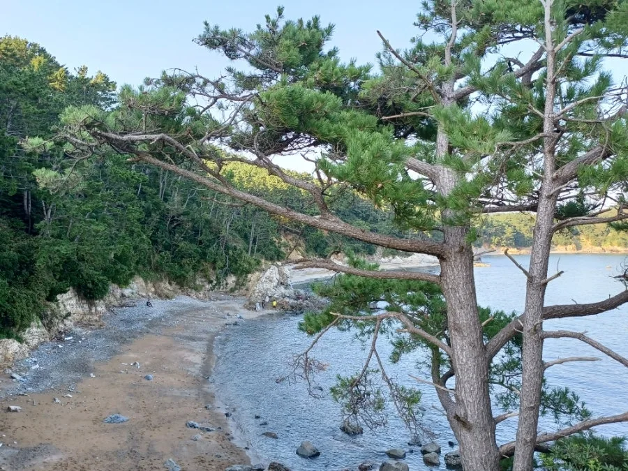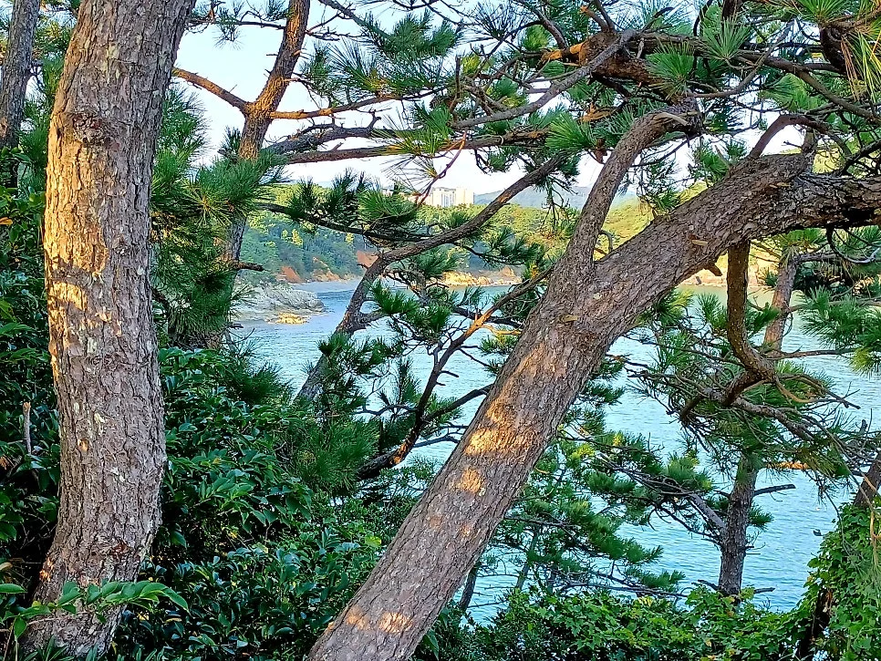 언뜻언뜻 소나무 사이로 드러나는 바다 빛깔이 희끄무레하다.