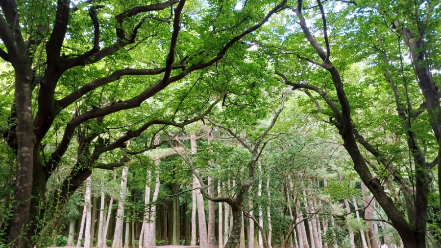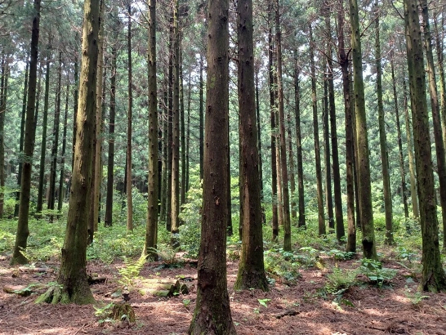 절물오름 자연휴양림 입구에는 4~50년생 쭉쭉 뻗은 삼나무가 울울창창 하늘을 가리고 미끈하게 잘 생긴 곰솔 숲도 볼만하다.