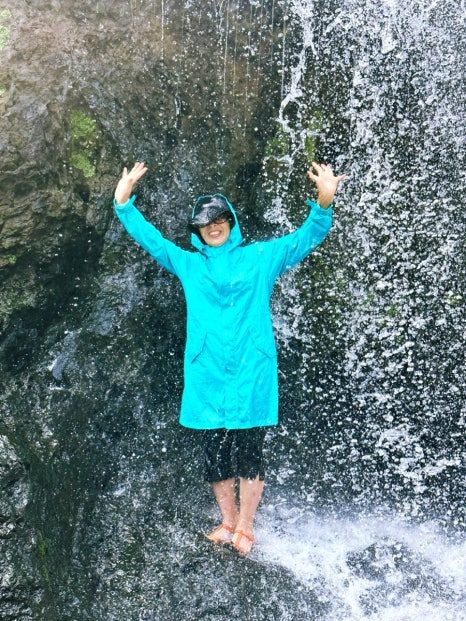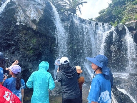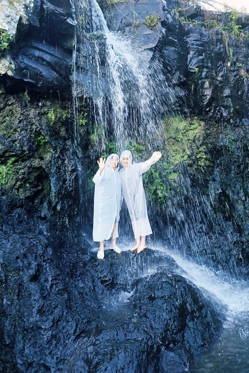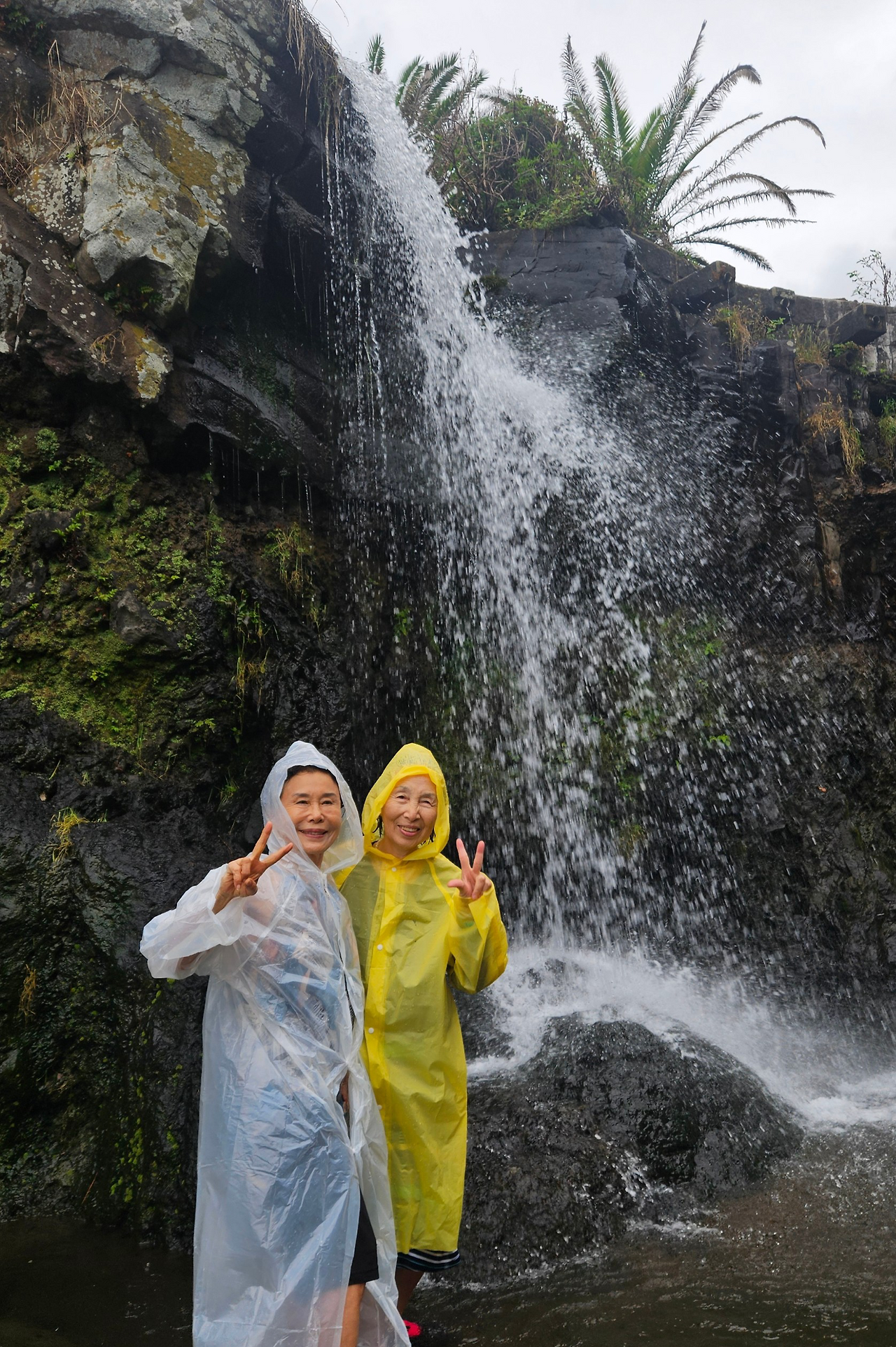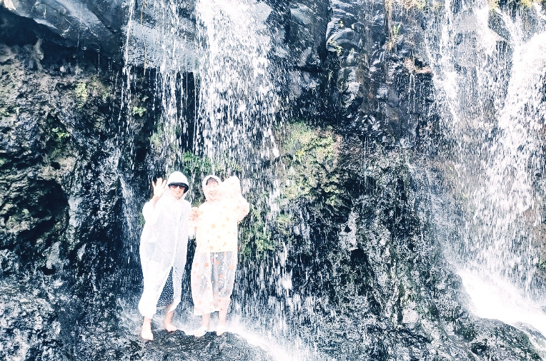 판초를 빌려 입고 조심스레 폭포수 아래로 접근해 들어갔다.
