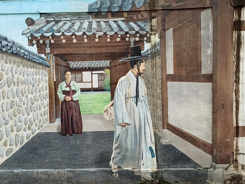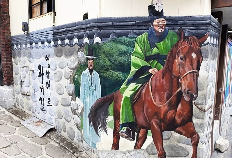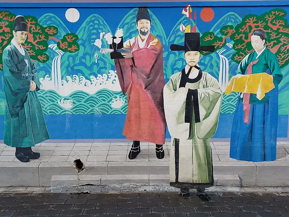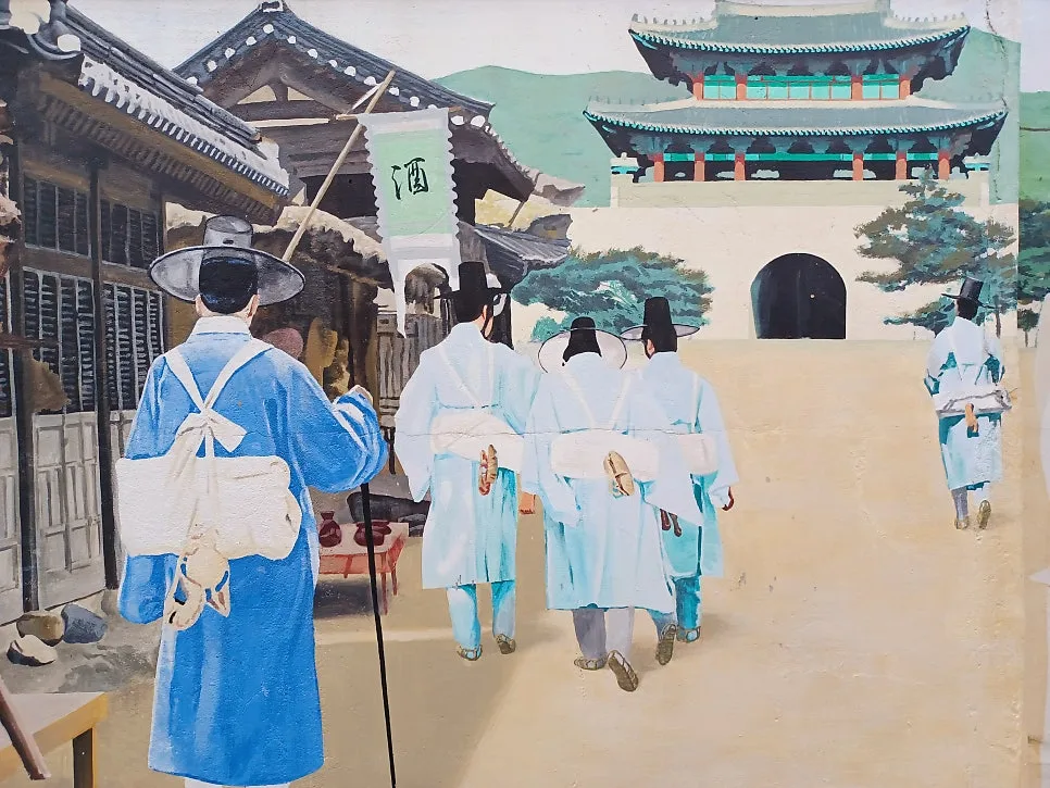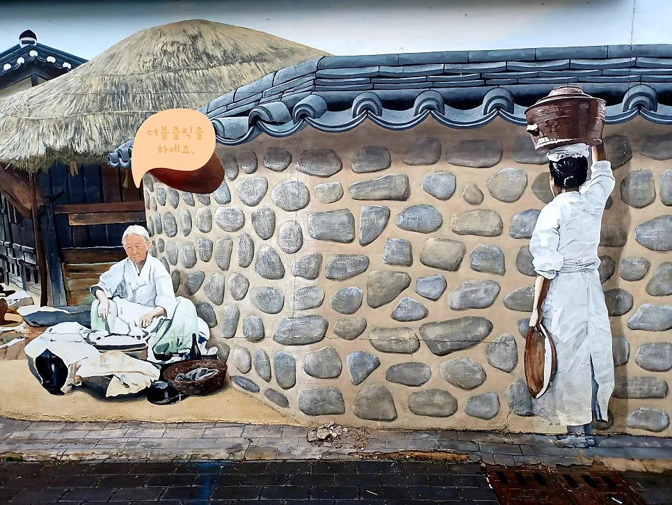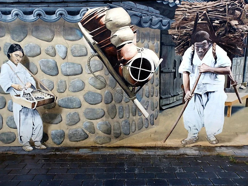 대구시 중구 계산동 현대백화점 뒤쪽에 복원된 영남대로 옛길 담벼락, 풍속화가 그려져 있다.