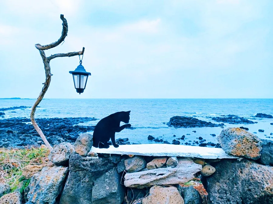 바로 이 사진, 바다를 배경으로 한 램프 아래 널빤지에 앉아 그루밍 삼매경에 빠진 까만 냥이.