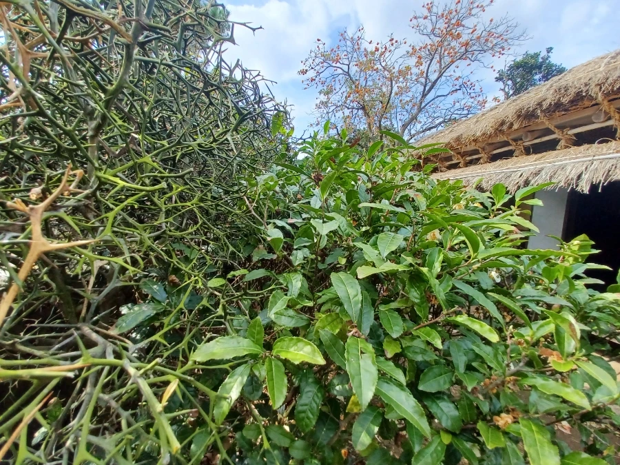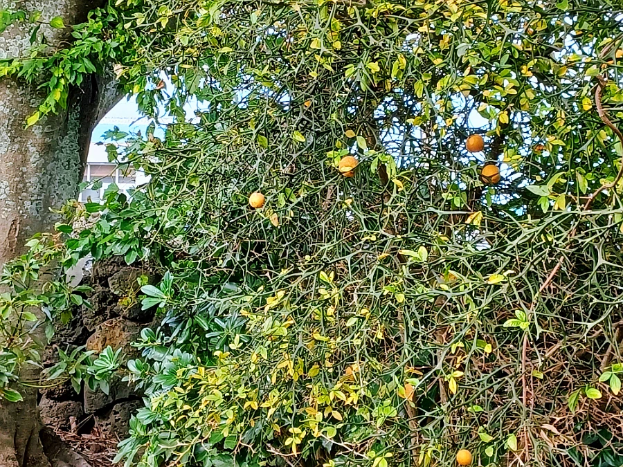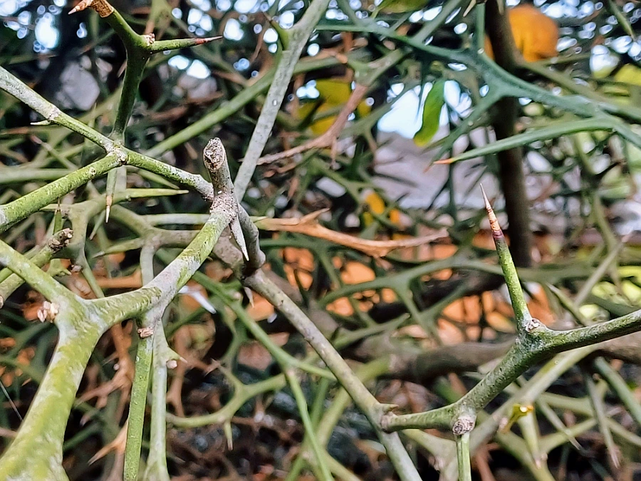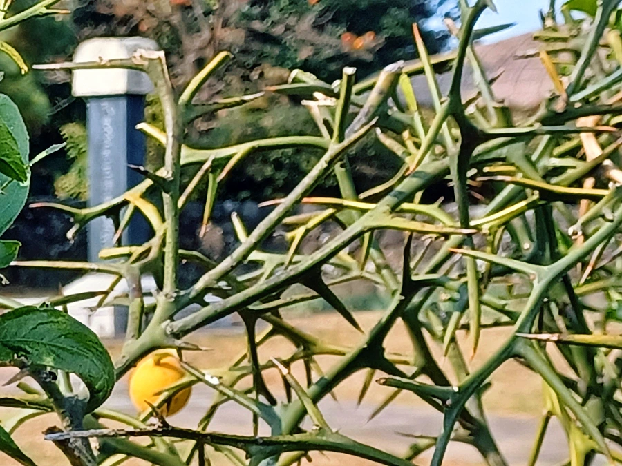 거기에서 조밀하게 얽히고설킨 가시 담, 탱자나무로 둘러싸인 울타리를 만났다.